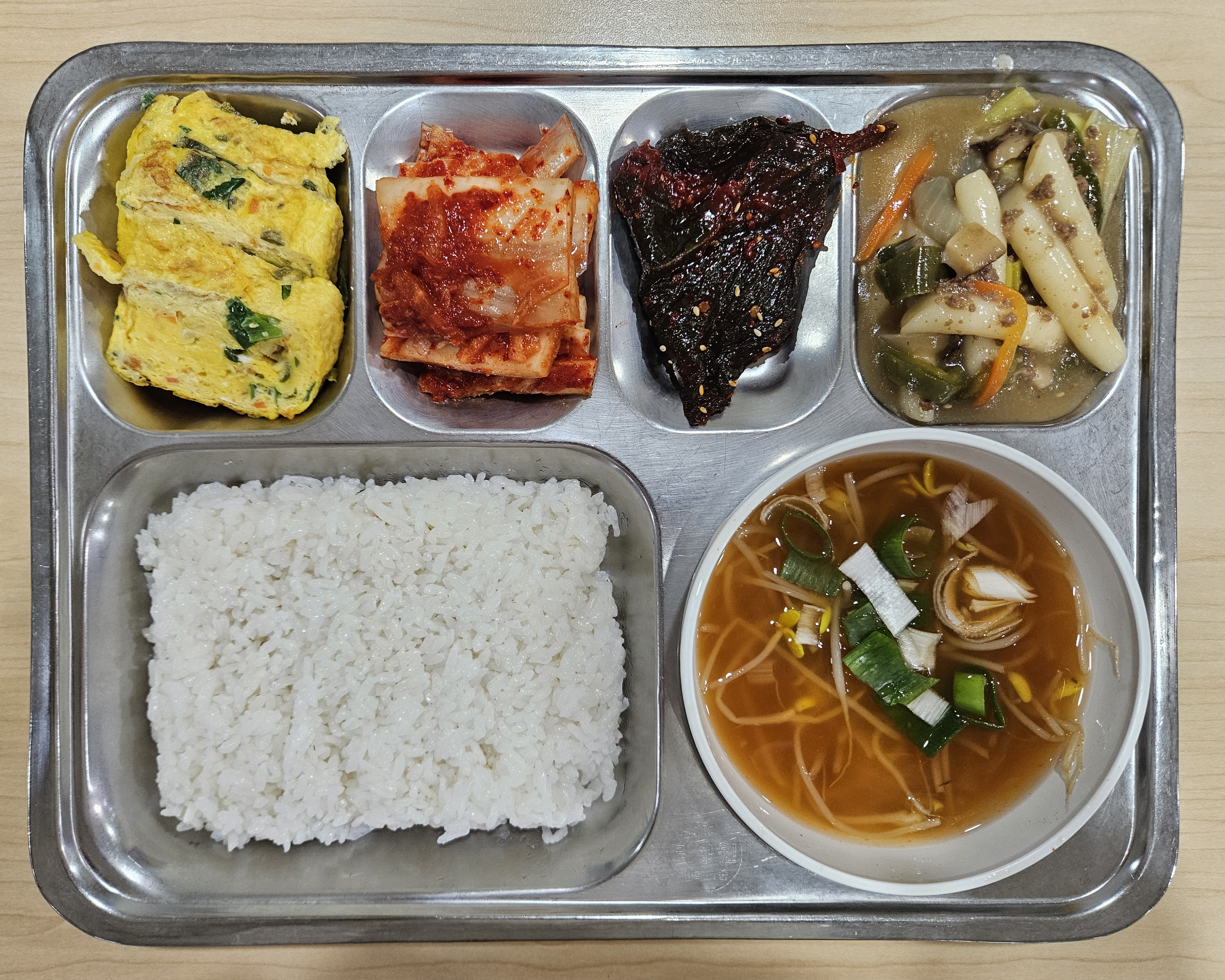 쌀밥 / 전주식콩나물국 / 야채계란말이 / 궁중떡볶이 / 양념깻잎지 / 배추김치