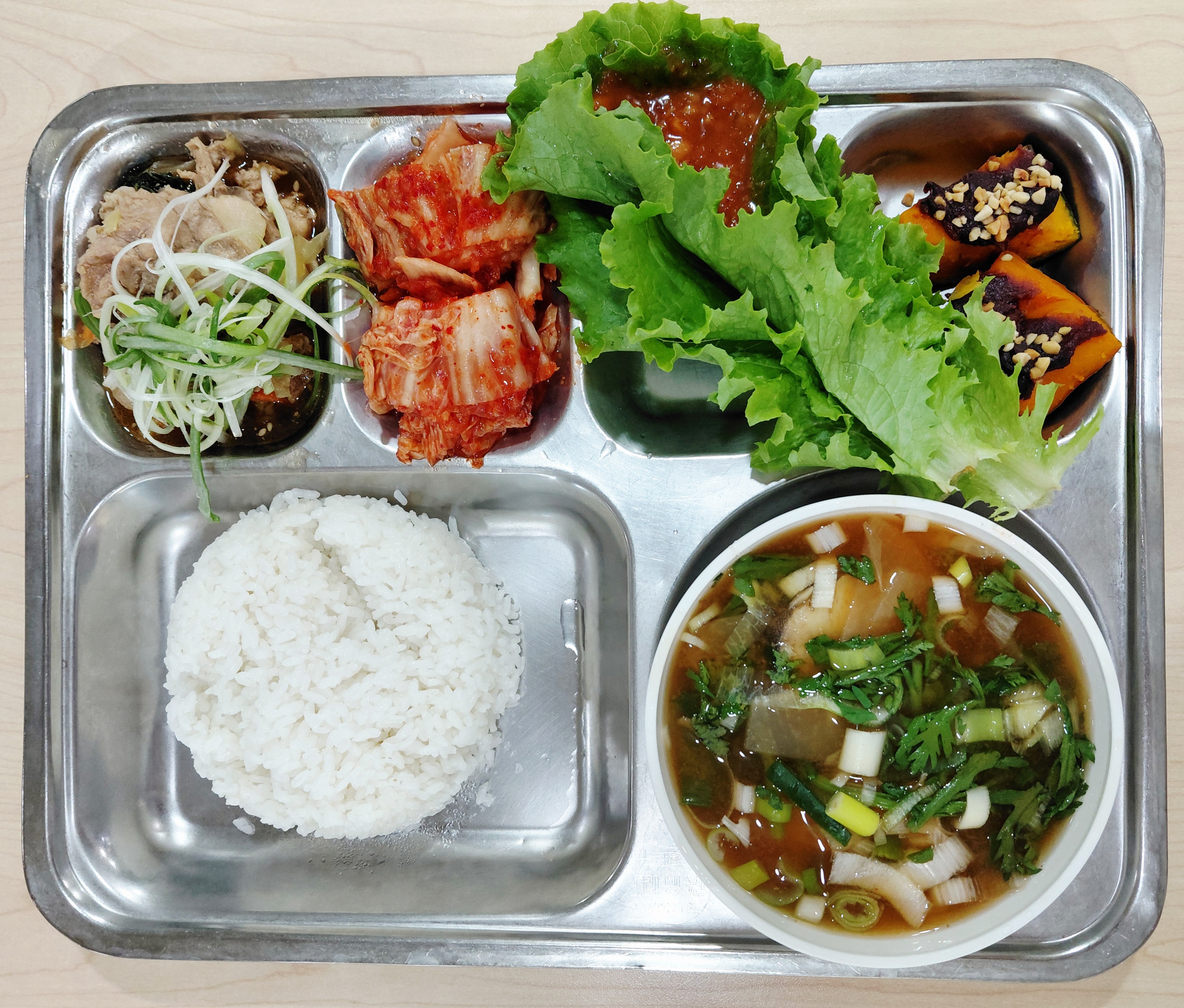 쌀밥/동태탕/돈육파채불고기/단호박팥찜/상추&쌈장/배추김치