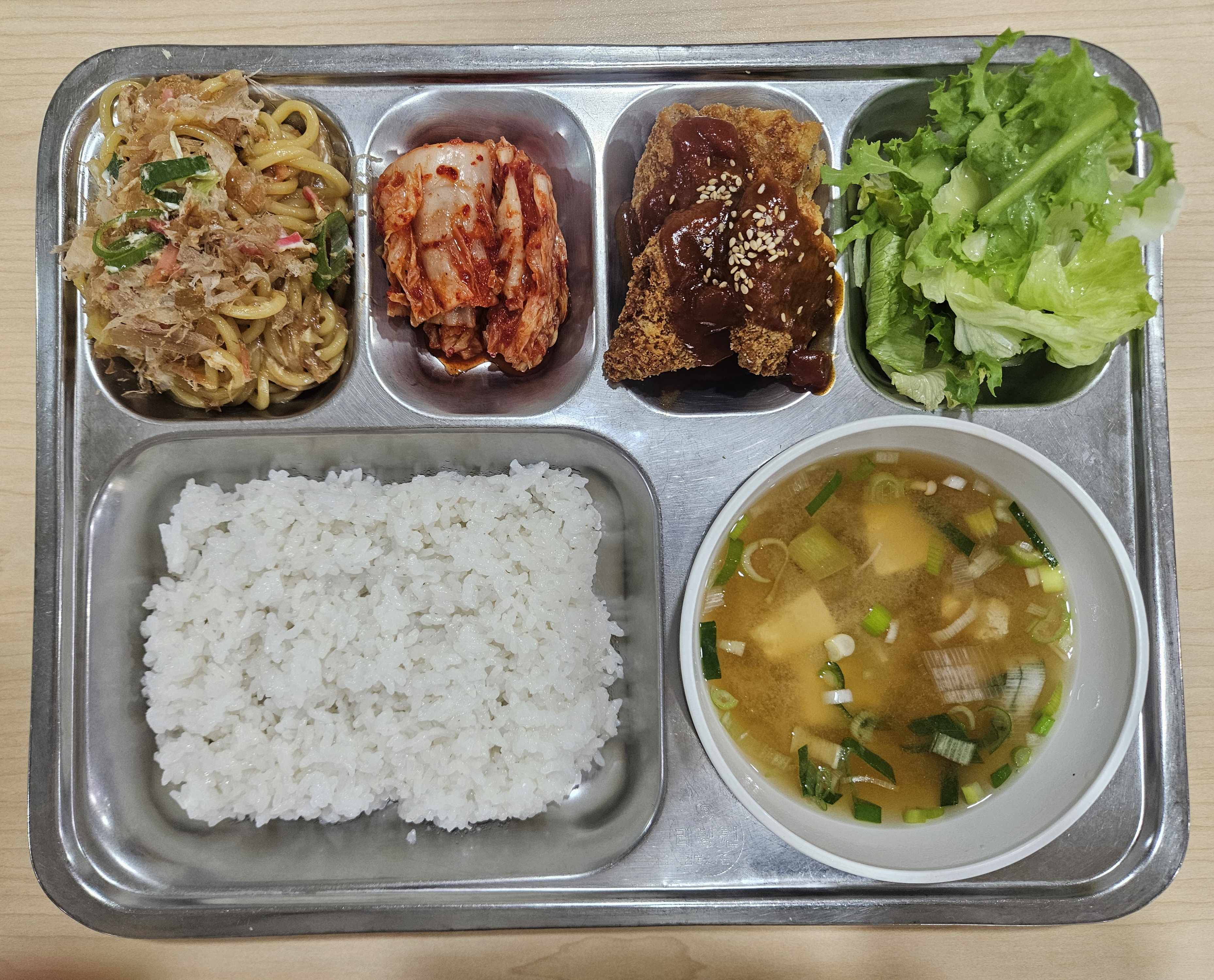 쌀밥 / 미소장국 / 돈까스&데미그라스소스 / 야끼소바 / 그린샐러드&키위드레싱 /배추김치