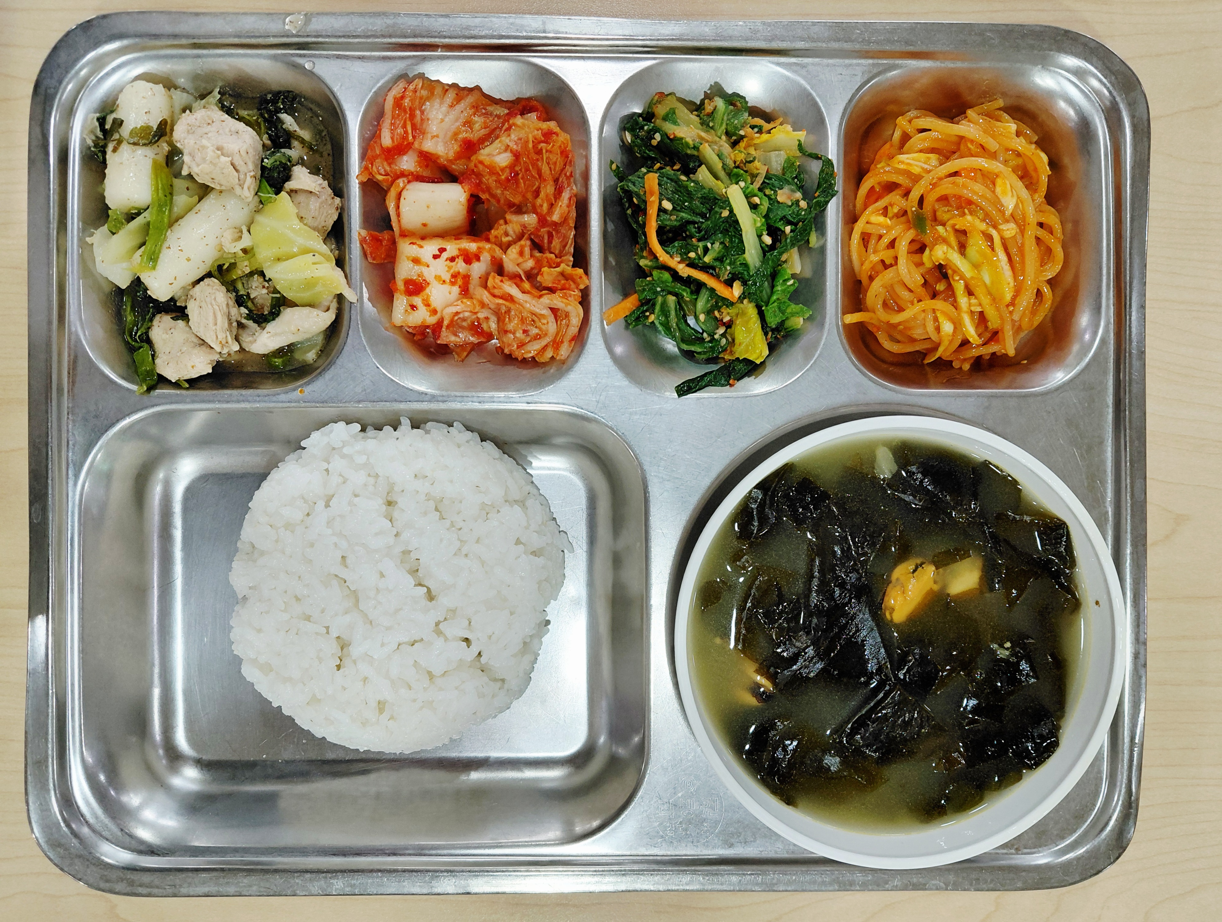 쌀밥/홍합미역국/들깨백닭갈비/비빔야채쫄면/얼갈이나물/배추김치
