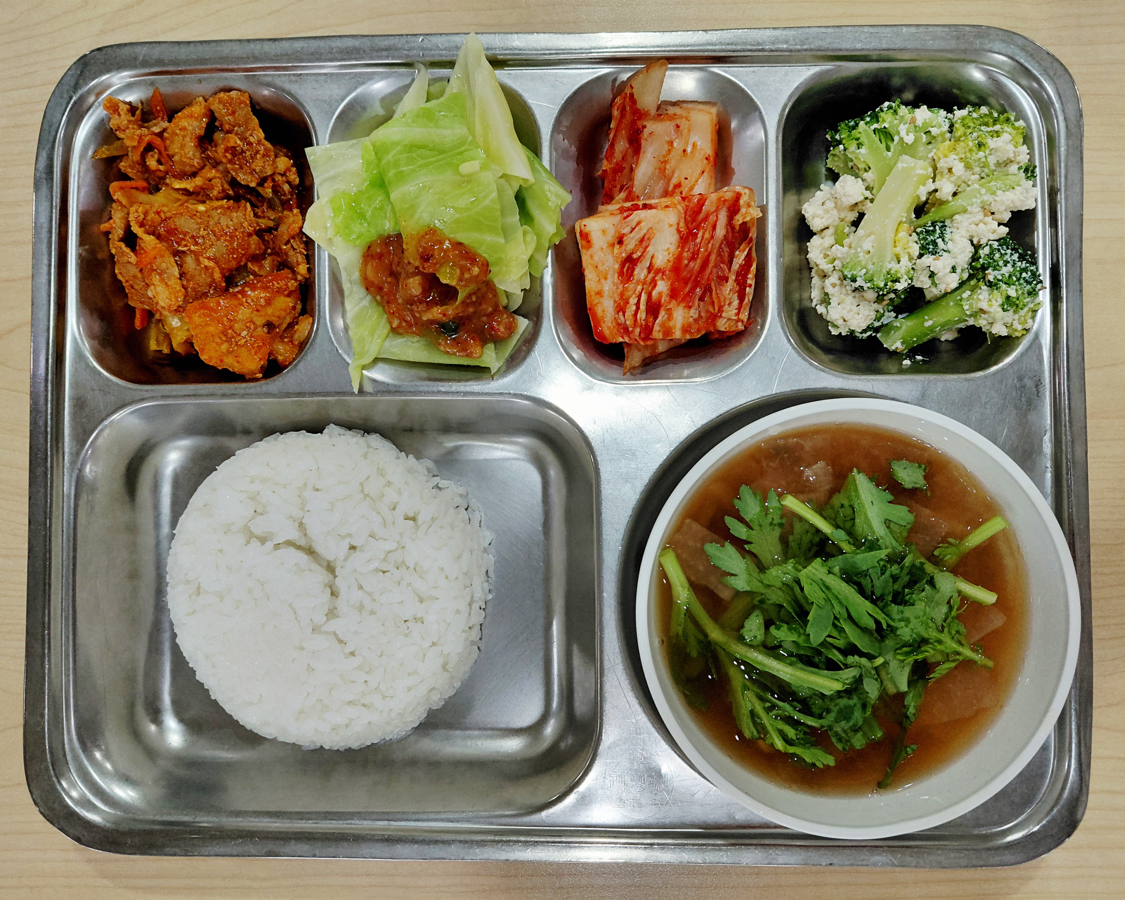쌀밥/오징어홍합국/제육볶음/브로콜리두부무침/양배추쌈&쌈장/배추김치