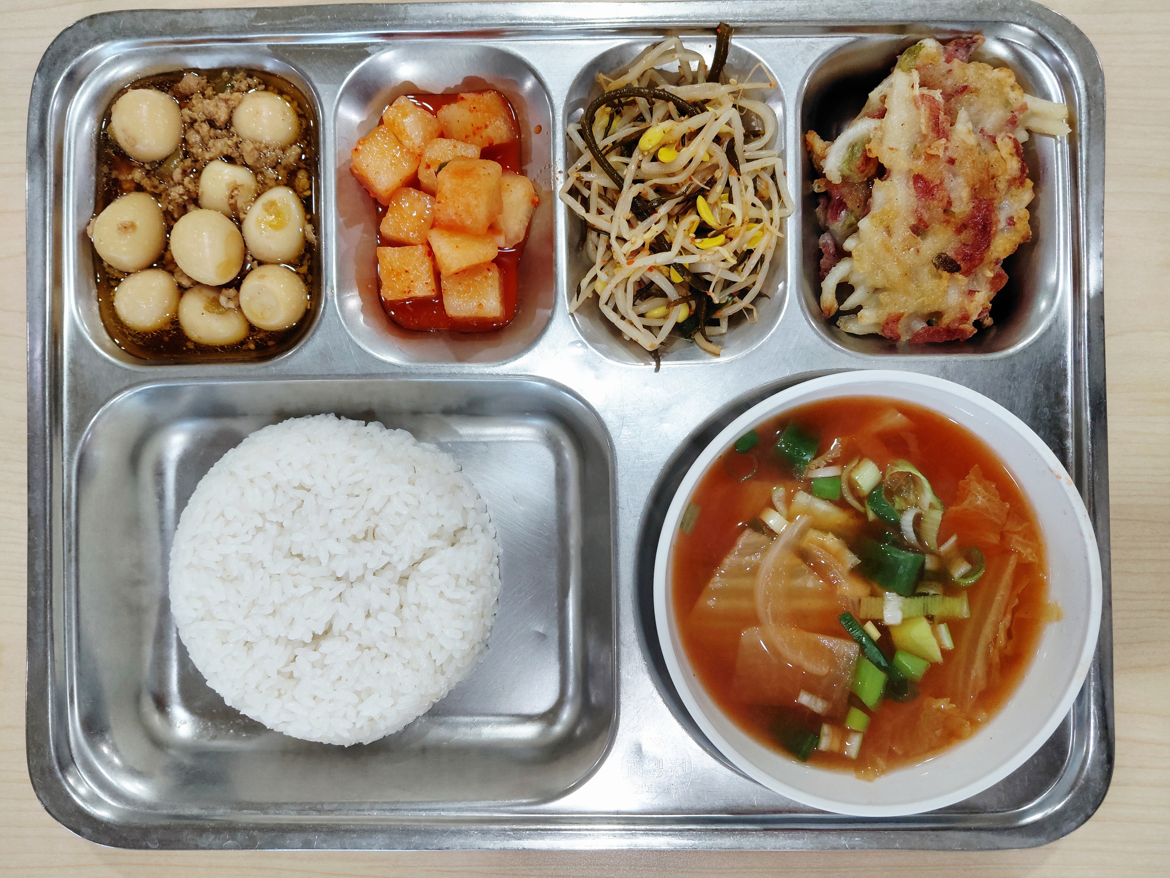 쌀밥/김칫국/소보로메란장조림/베이컨감자채전/톳콩나물무침/깍두기