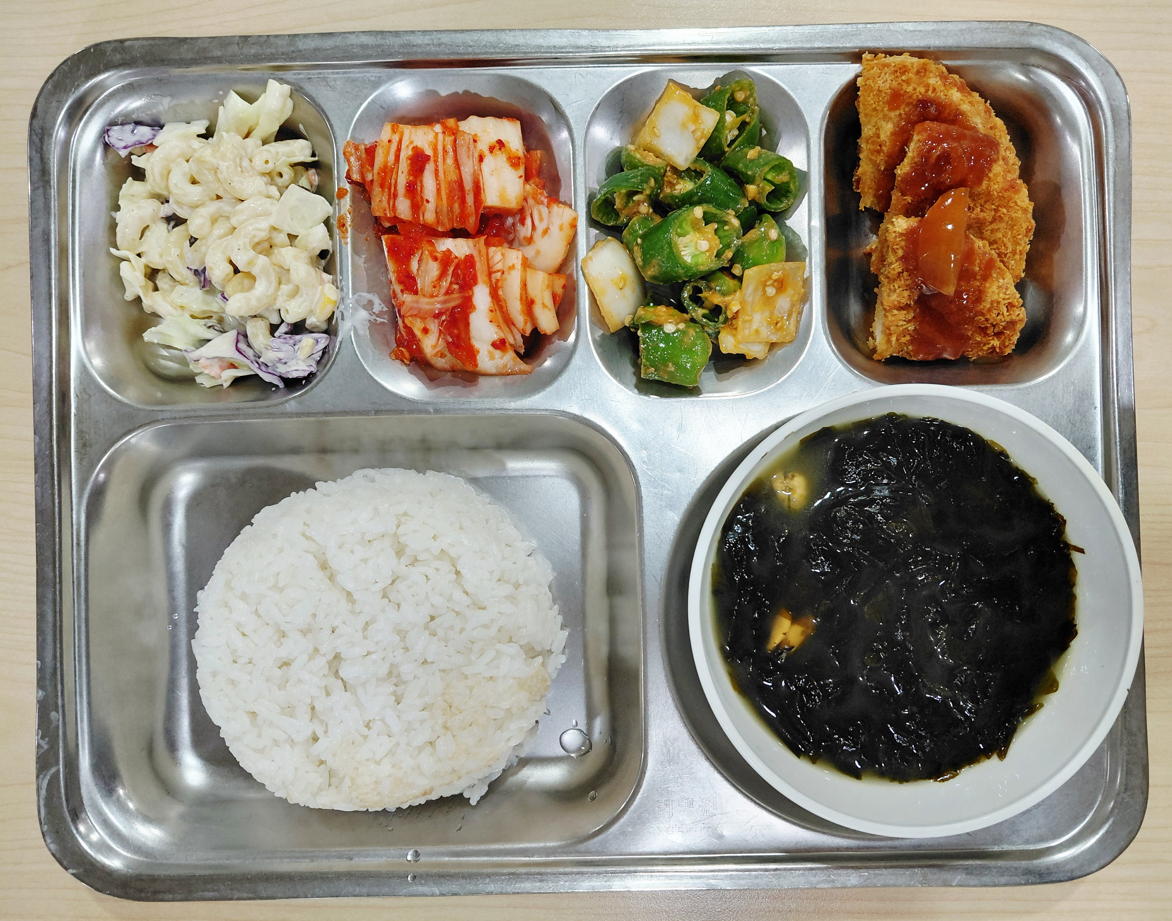 쌀밥/홍합미역국/돈까스&소스/마카로니콘범벅/아삭이고추무침/배추김치