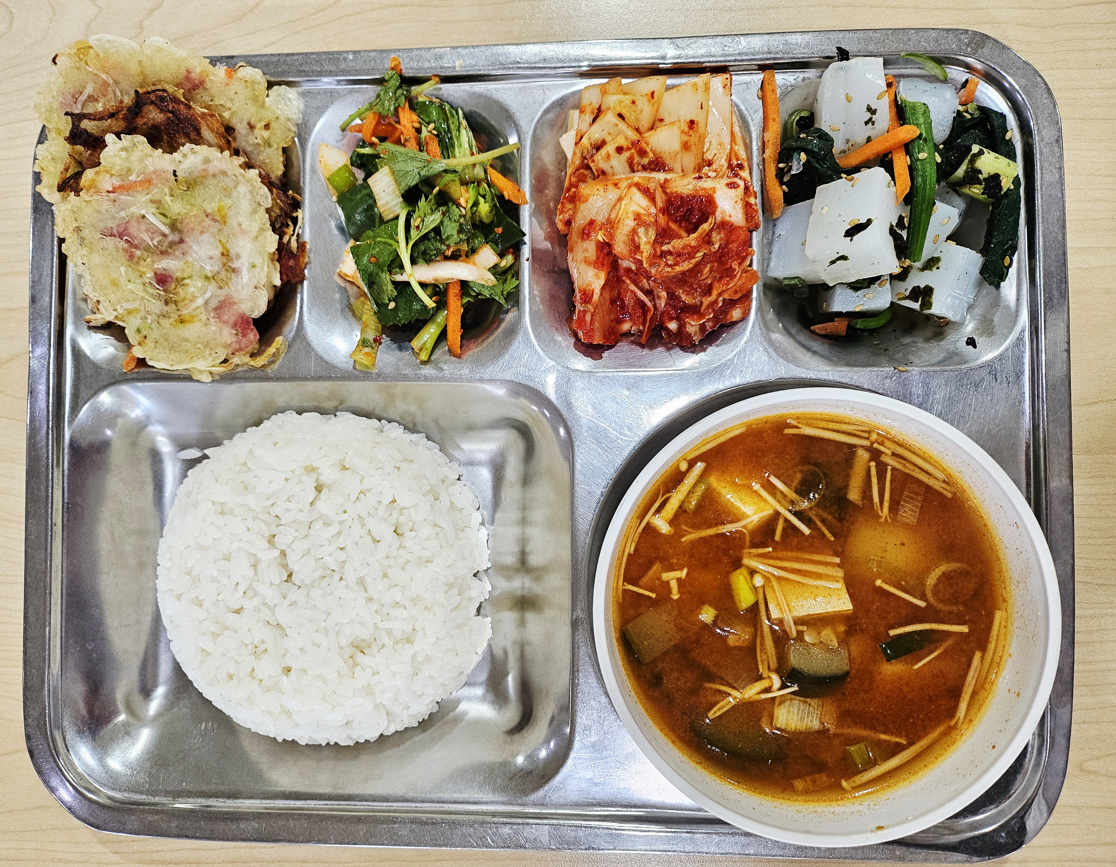 쌀밥/고추장찌개/숙주전&양념장/시금치청포묵무침/모둠채소겉절이/배추김치
