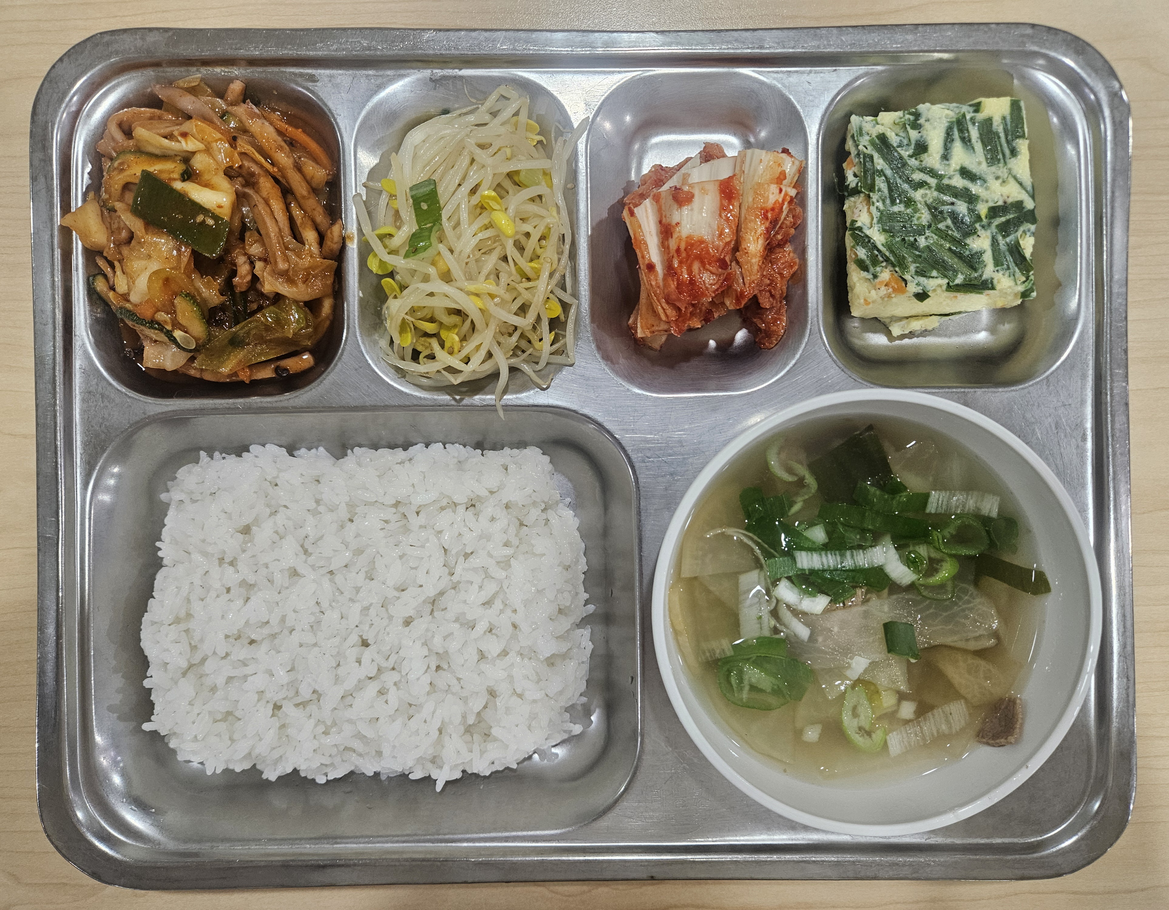 소고기무국 / 야채계란찜 / 오징어야채볶음 / 콩나물무침 / 배추김치