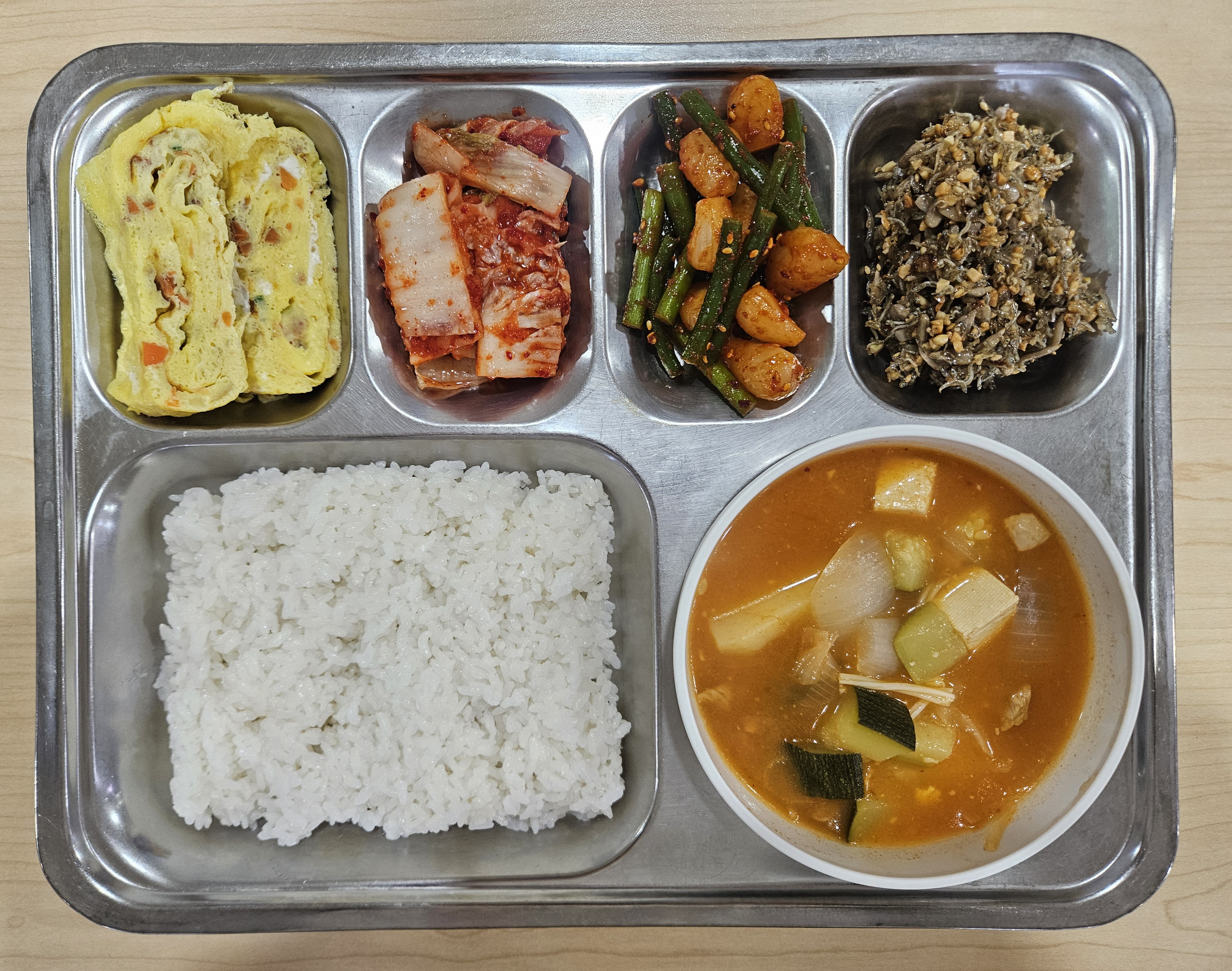 쌀밥 / 고추장찌개 / 계란말이 / 견과류멸치볶음 / 마늘쫑락교무침 / 배추김치