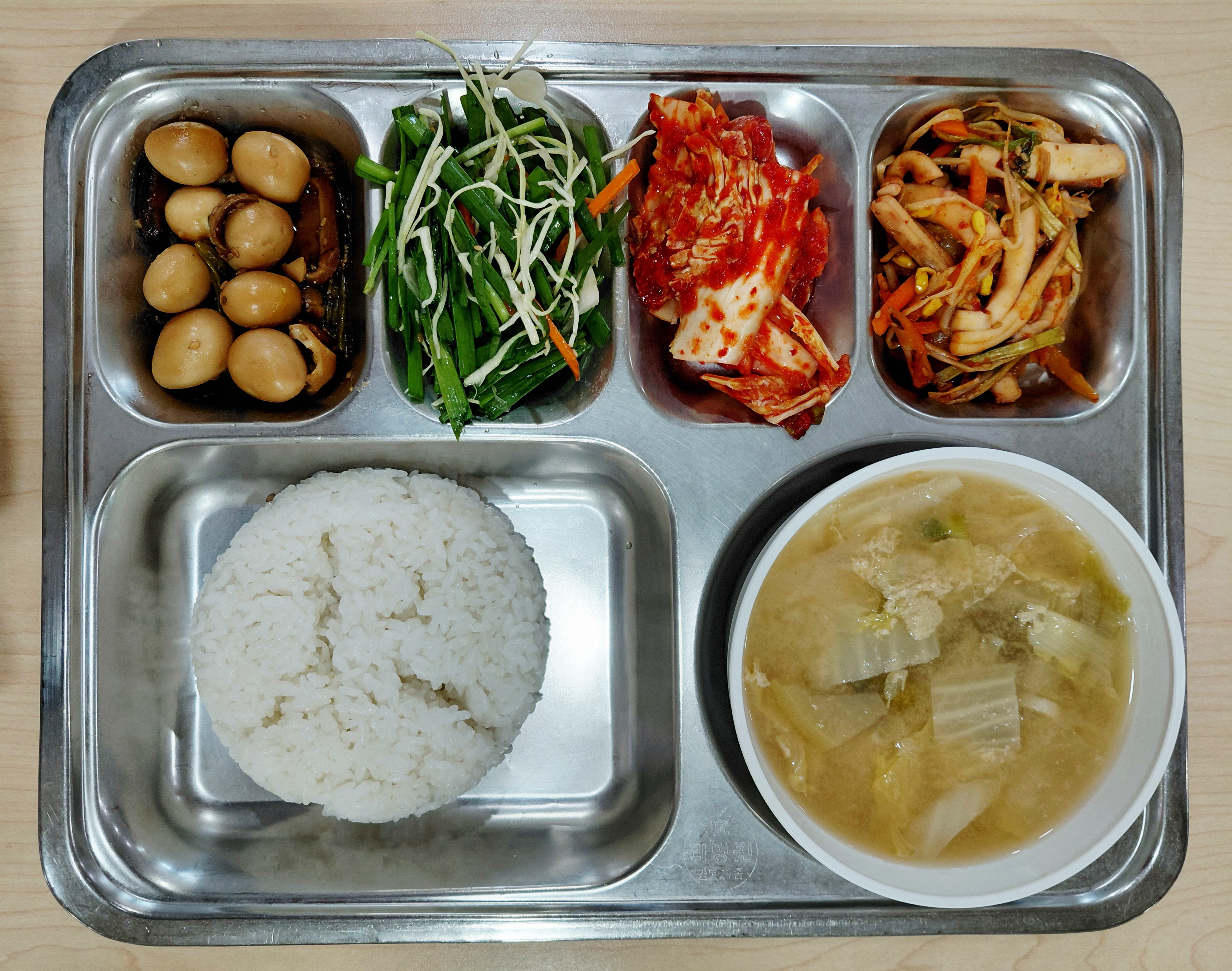 쌀밥/콩가루배추국/오징어콩나물찜/메추리알장조림/오리엔탈부추무침/배추김치