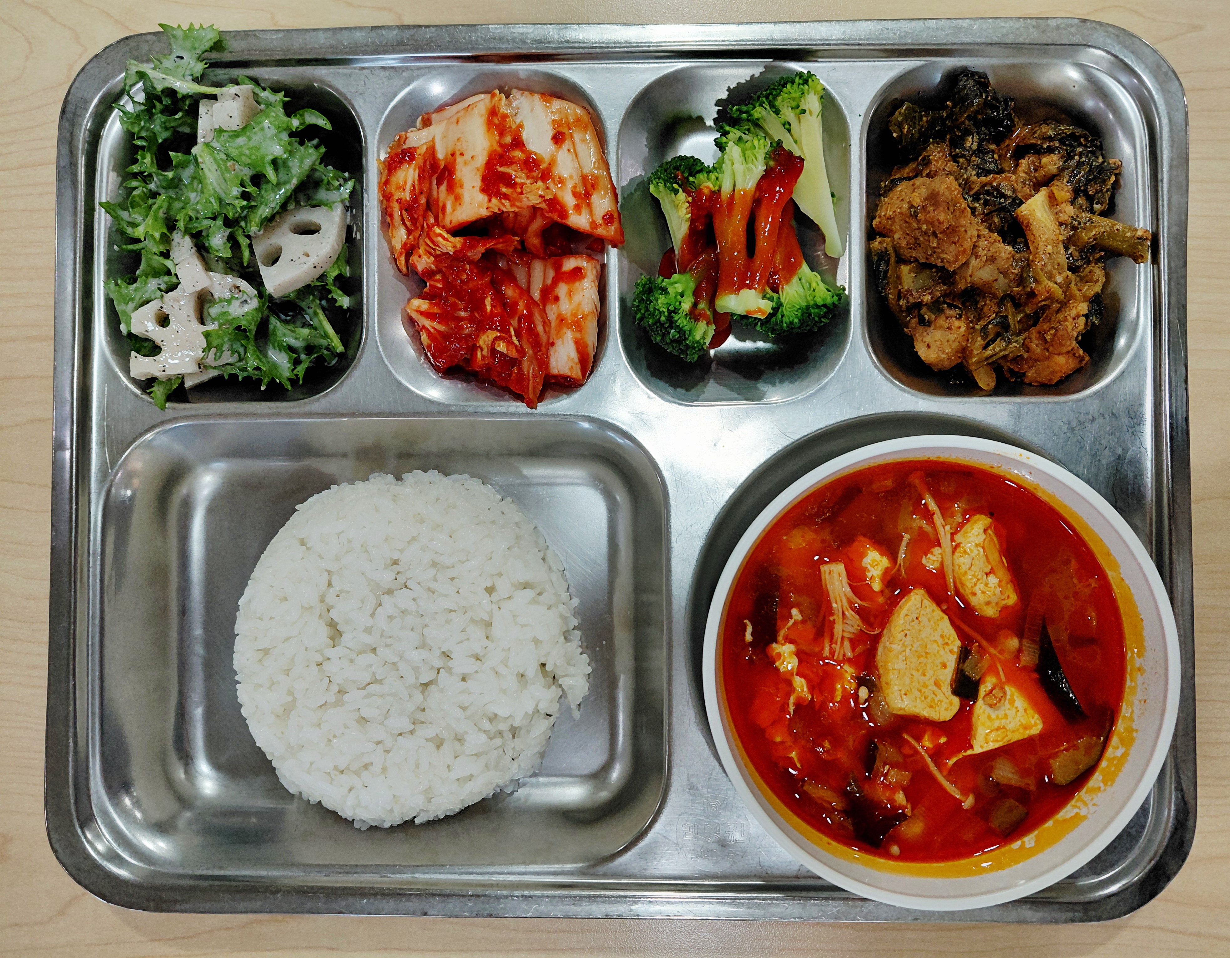 쌀밥/순두부찌개/돈육시래기찜/연근흑임자무침/브로콜리&초장/배추김치
