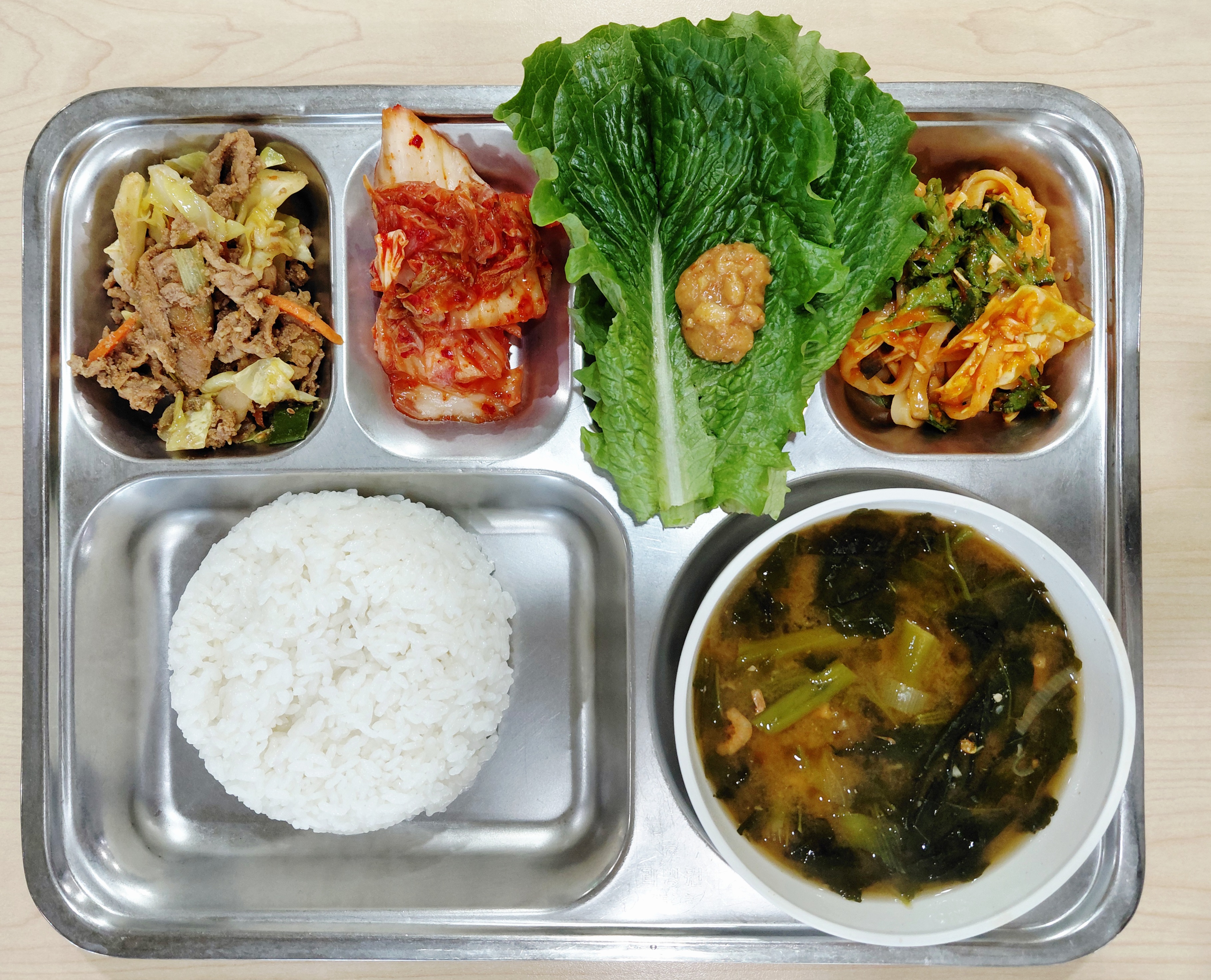 쌀밥/건새우아욱된장국/청양풍돈불고기/비빔칼국수/상추&쌈장/배추김치
