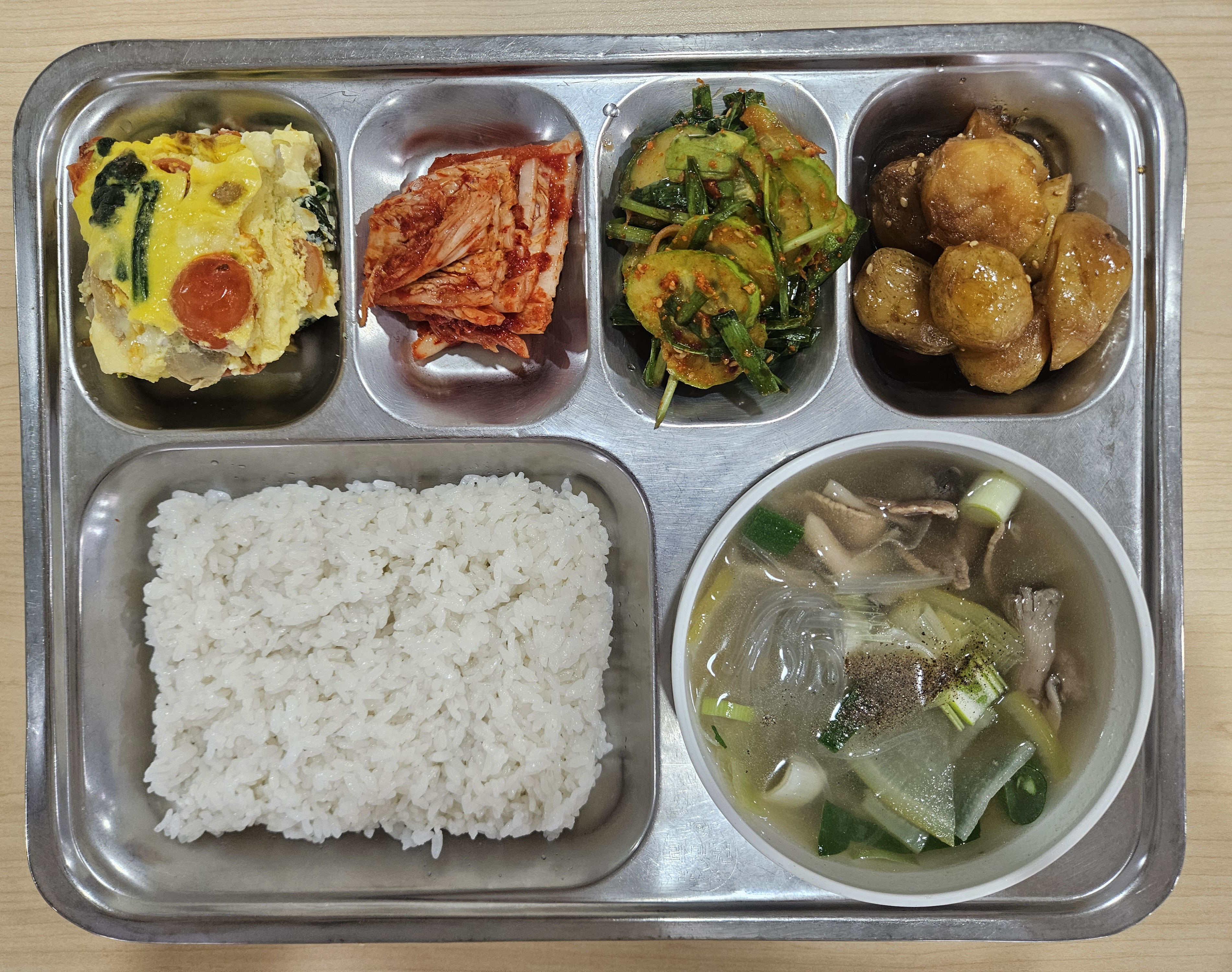 쌀밥 / 소고기당면국 / 시금치프리타타 / 알감자조림 / 오이부추무침 / 배추김치